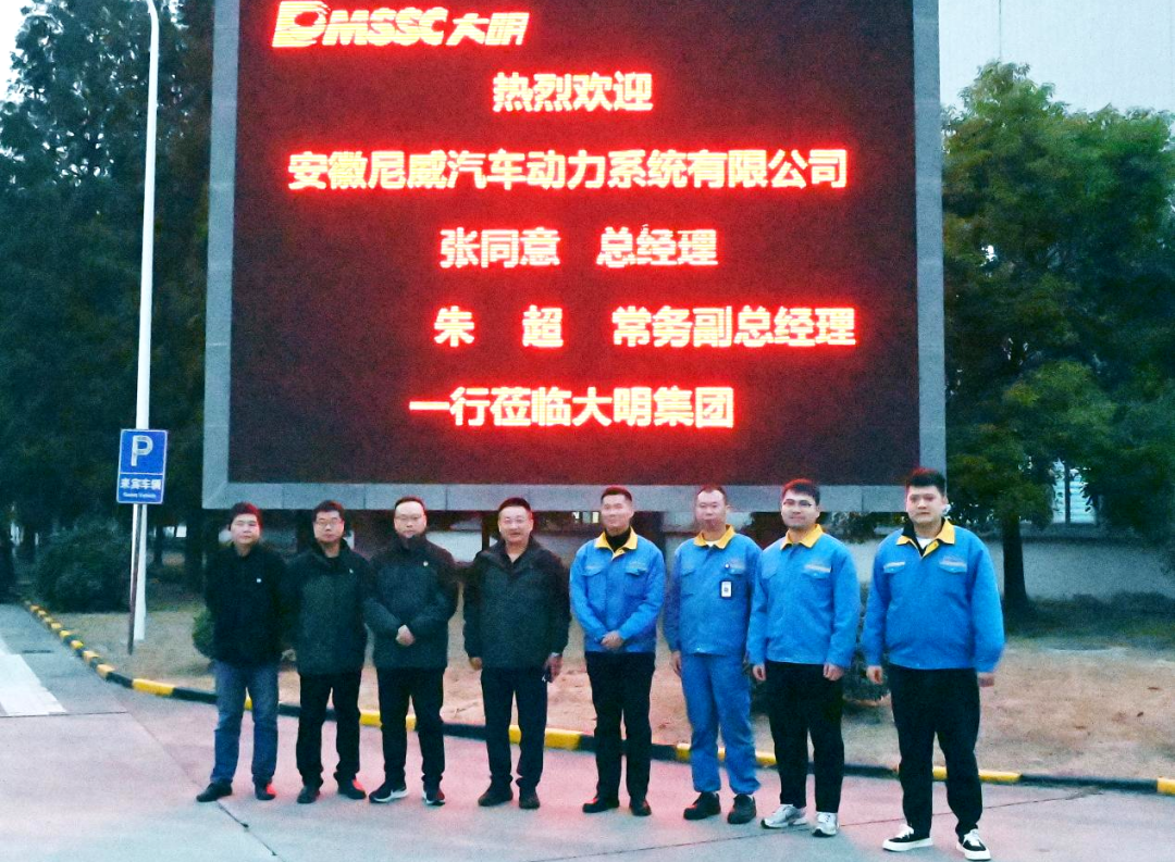 12月13日,安徽尼威汽车动力系统有限公司总经理张同意、常务副总经理朱超等来访大明。靖江大明副总经理袁康、左野明等热情接待。张同意总经理一行在袁康副总经理的陪同下,首先参观了大明靖江基地和长江码头,实地了解了大明在材料保供、先进设备、技术服务、物流运输等方面的服务优势。