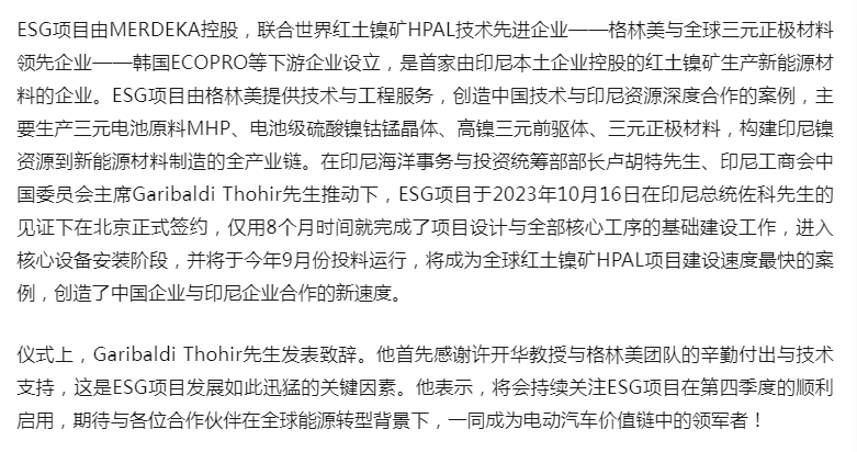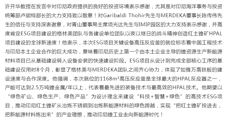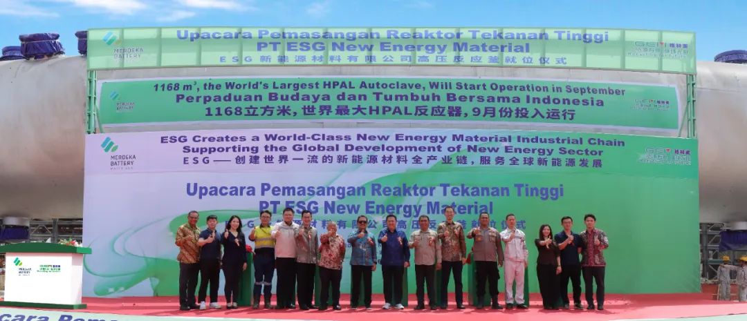 2024年6月8日,青美邦园区隆重举行ESG项目关键设备高压反应釜(1168m³)就位仪式,印尼海洋事务与渔业部部长Sakti Wahyu Trenggono先生,印尼工商会中国委员会主席、MBM股东代表Garibaldi Thohir先生,MBM股东代表Hardi Wijaya Liong先生,莫罗瓦利县长助理Rizal先生,永青集团副总裁王仁辉先生,格林美集团董事长许开华教授、建设单位代表等领导嘉宾共计200余人受邀出席。