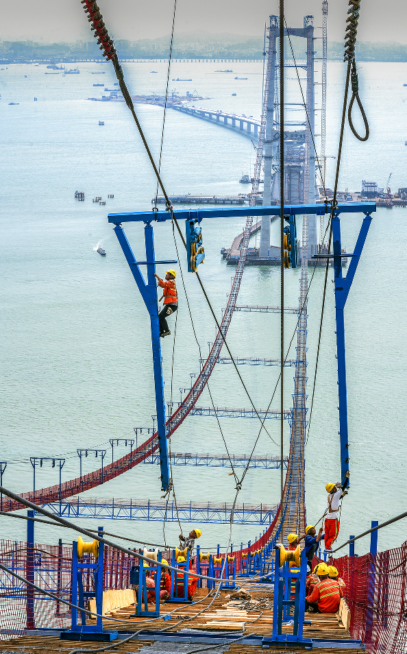 “为了保证往来船只顺利通航,深中大桥桥面高达91米,相当于30层楼高,是世界上最高通航净空的跨海桥梁。加之处在珠江口开阔水域,强台风频发,国外著名桥梁公司认为‘无法满足抗风安全要求’。”深中通道管理中心常务副主任范传斌说。“哪里能服输!”范传斌回忆道,在深中通道管理中心牵头组织下,多个单位联合攻关,历时3年多,研发了新型组合气动控制技术,攻克了台风频发区超大跨整体钢箱梁悬索桥灾变控制技术,一举打破了国外权威的论断。除此之外,正交异性钢桥面板疲劳及海中悬索桥主缆防腐等问题,也是世界性难题。悬索桥,指的是以通过索塔悬挂并锚固于两岸或桥两端的缆索作为上部结构主要承重构件的桥梁。“缆索是悬索桥受力的关键构件之一,也是悬索桥的‘生命线’。”范传斌介绍,深中大桥跨度大,且长期处于高温、高盐、高湿的海洋环境,金属腐蚀疲劳问题突出,全寿命周期不能更换,对缆索强度、耐腐蚀性要求极高。为此,深中大桥所使用的主缆钢丝十分特别:6毫米直径、2060兆帕的锌铝多元合金镀层钢丝,其耐盐雾腐蚀性能至少是现有热镀锌钢丝的1倍、锌铝镀层钢丝的2倍。“无论是强度还是耐腐蚀性能,都达到了世界领先水平。这也是我国自主研发的2060兆帕钢丝‘中国芯’在世界上首次大规模应用于悬索桥主缆建造。”范传斌介绍,深中大桥上下游共设两根主缆,单根主缆长约3000米、重约17000吨,由199束索股组成,每束索股又由127丝高强钢丝组成,单丝承载力可以吊起三辆小汽车。一桥飞架,跨越伶仃。五年时间里,建设团队克服了全海上作业、建设条件复杂、频发强台风等诸多不利条件,最终让深中大桥巍然矗立于海天之间。如今,自东向西,粤港澳大湾区世界级跨海集群工程深中通道若游龙潜海,又似长龙卧波,再次一举打破珠江两岸时空局限,为大湾区这片发展热土再添跨海通道。