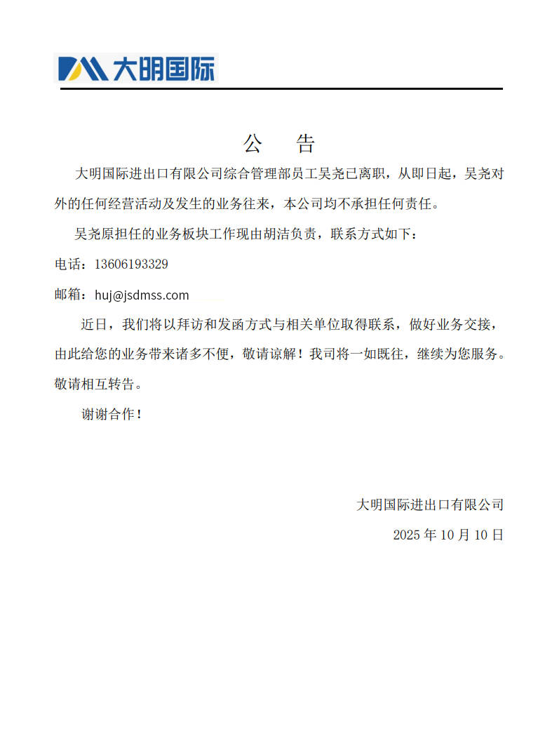 近日,我们将以拜访和发函方式与相关单位取得联系,做好业务交接,由此带来的诸多不便,敬请谅解,我司