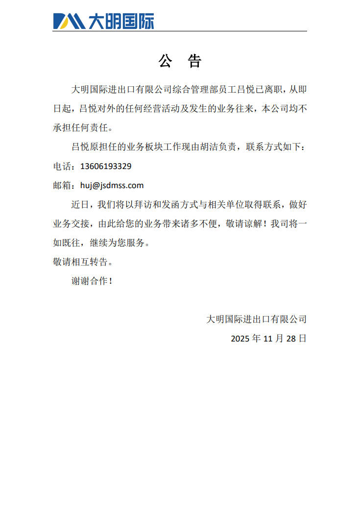 近日,我们将以拜访和发函方式与相关单位取得联系,做好业务交接,由此带来的诸多不便,敬请谅解,我司