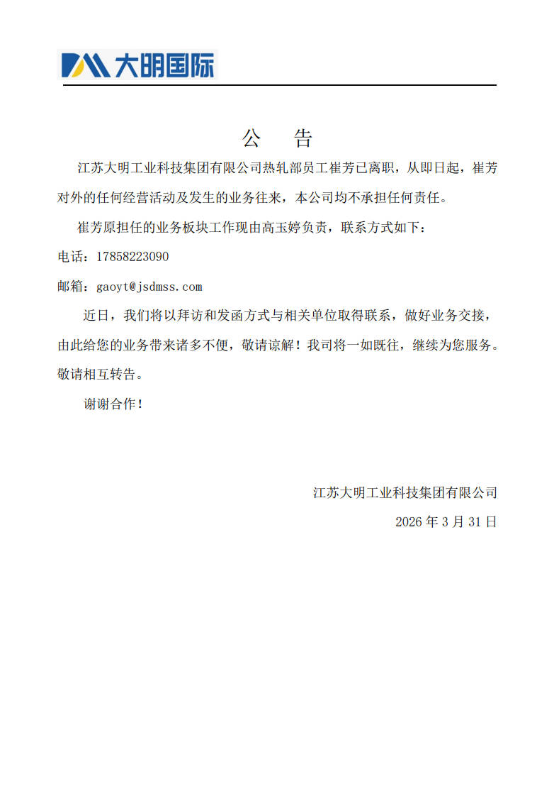 关于崔芳的离职公告