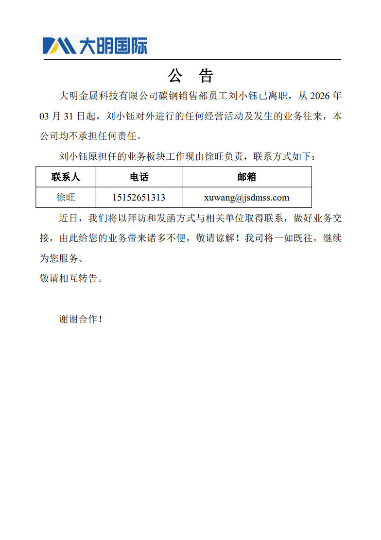 关于刘小钰的离职公告