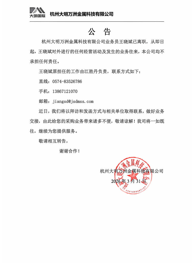 关于王晓斌的离职公告