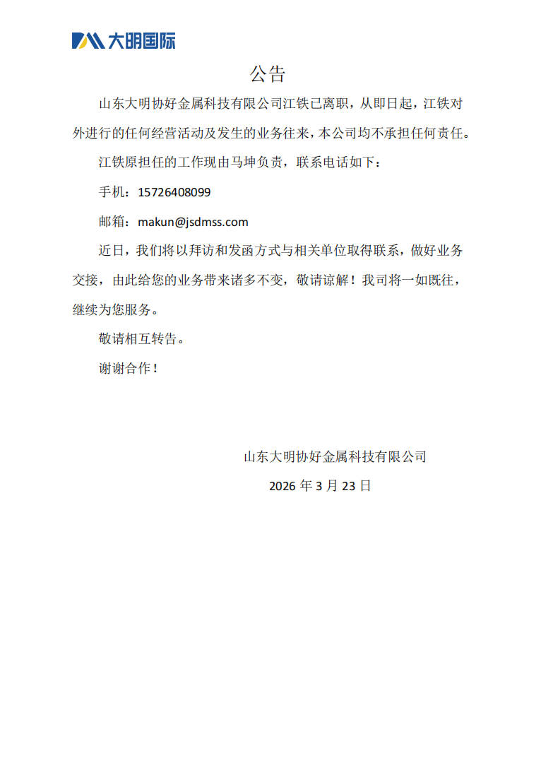 关于江铁的离职公告