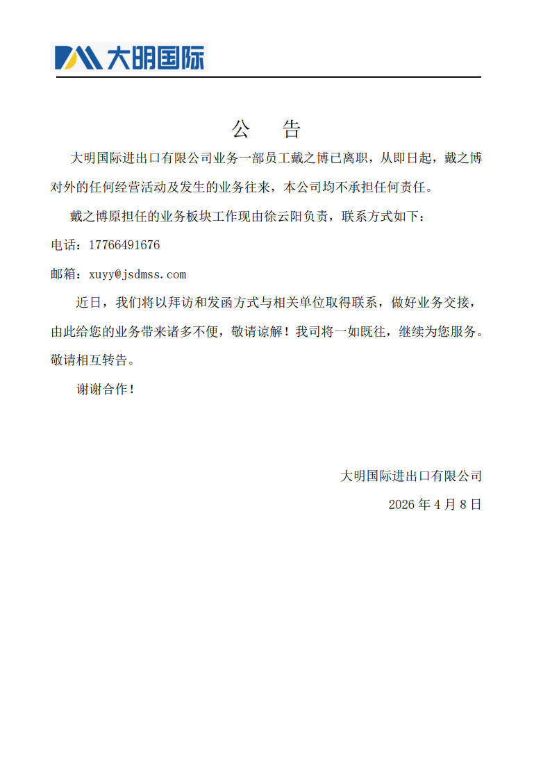 关于戴之博的离职公告