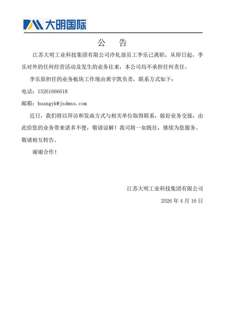 关于李乐的离职公告
